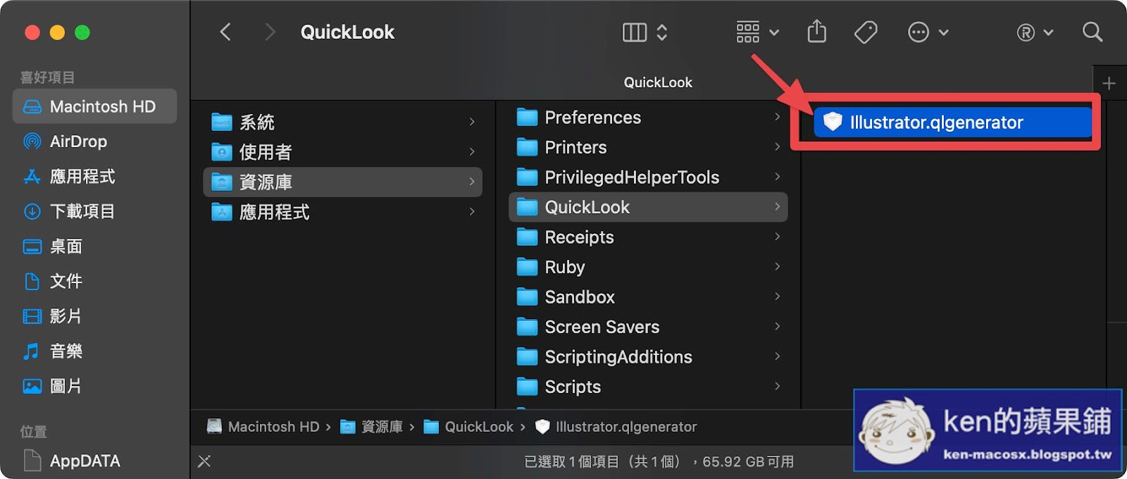 點一下 「 Illustrator.qlgenerator 」檔,按「滑鼠右鍵」選擇「顯示套件內容」